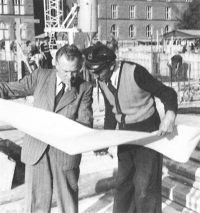 Karl Brannath auf einer Baustelle, Foto: Mieter- und Bauverein eG, Karlsruhe, aus: Susanne Richter (Hrsg.): Spuren in der Stadt: Beiträge der Fachhochschule Karlsruhe - Hochschule für Technik zur Karlsruher Stadtentwicklung 1878-2003, Karlsruhe 2003, S. 108.