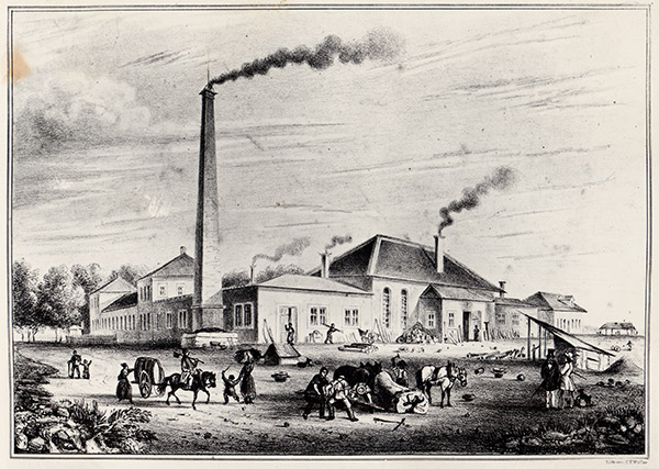 Die Kesslersche Maschinenfabrik beim Ettlinger Tor, Lithographie um 1840, Stadtarchiv Karlsruhe 8/PBS oXIVf 37.