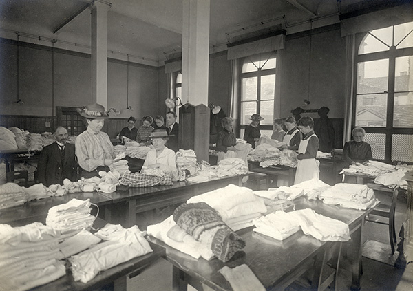 Frauen beim Sortieren von Wäschespenden für Soldaten im Versteigerungssaal der Städtischen Pfandleihe, heute Lesesaal des Stadtarchivs, März 1918, Stadtarchiv Karlsruhe 8/PBS VI 282.