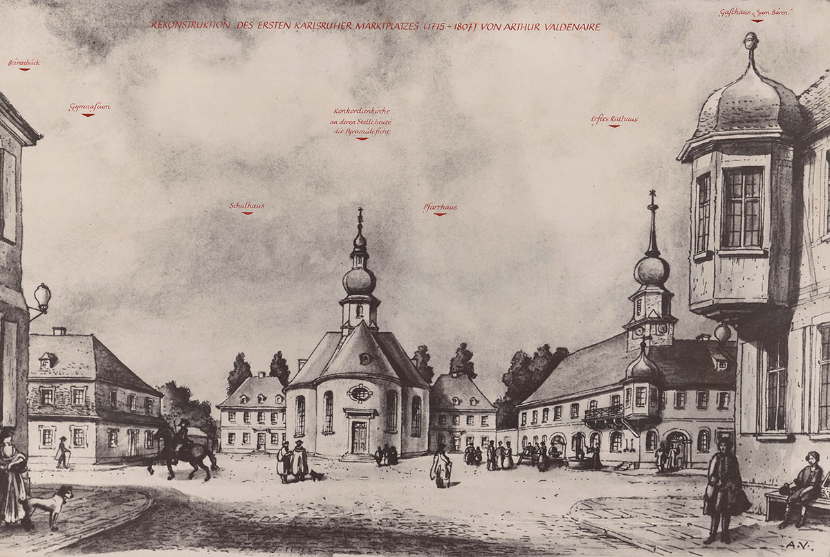 Rekonstruktion der Marktplatz-Situation um 1730, Foto einer Zeichnung des Architekten und Denkmalpflegers Arthur Valdenaire, um 1935, Stadtarchiv Karlsruhe 8/PBS XIIIb 50.