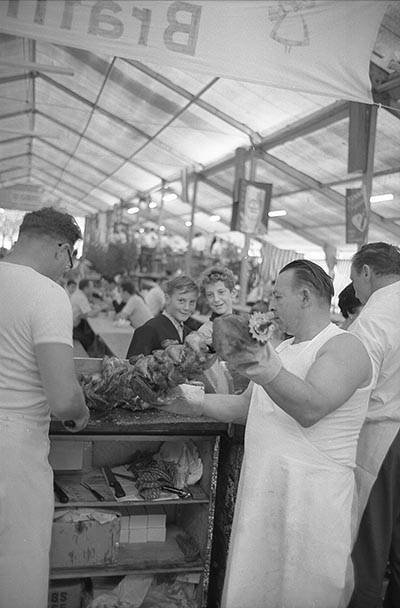 Zwei Vereinsmitglieder am Hähnchengrill, 1968, Stadtarchiv Karlsruhe 8/BA Schlesiger A16//25a/2/29.