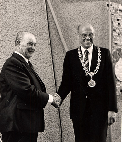 Einführung von Gerhard Seiler (mit Amtskette) in das Amt des Oberbürgermeisters im Bürgersaal des Rathauses, 1. Juli 1986, Stadtarchiv Karlsruhe 8/PBS oIII 1400.