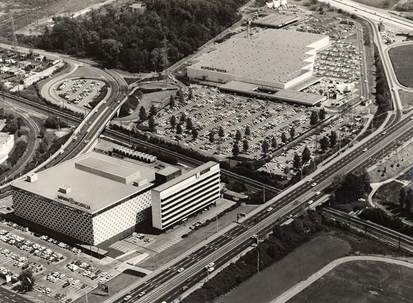 Luftbild des Firmengeländes Mann Mobilia und Wertkauf an der Durlacher Allee, um 1988, Stadtarchiv Karlsruhe 8/PBS oXIVe 753.