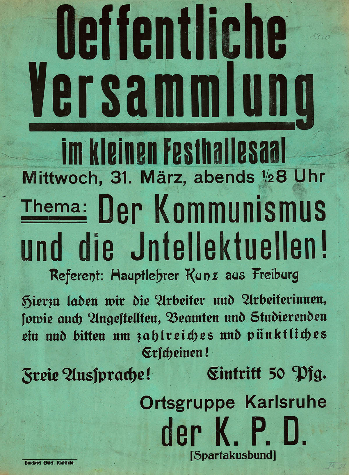 Ankündigung einer öffentlichen Versammlung der KPD (Ortsgruppe Karlsruhe) im kleinen Festhallesaal, 31. März 1920, Stadtarchiv Karlsruhe 8/PBS X 1272.
