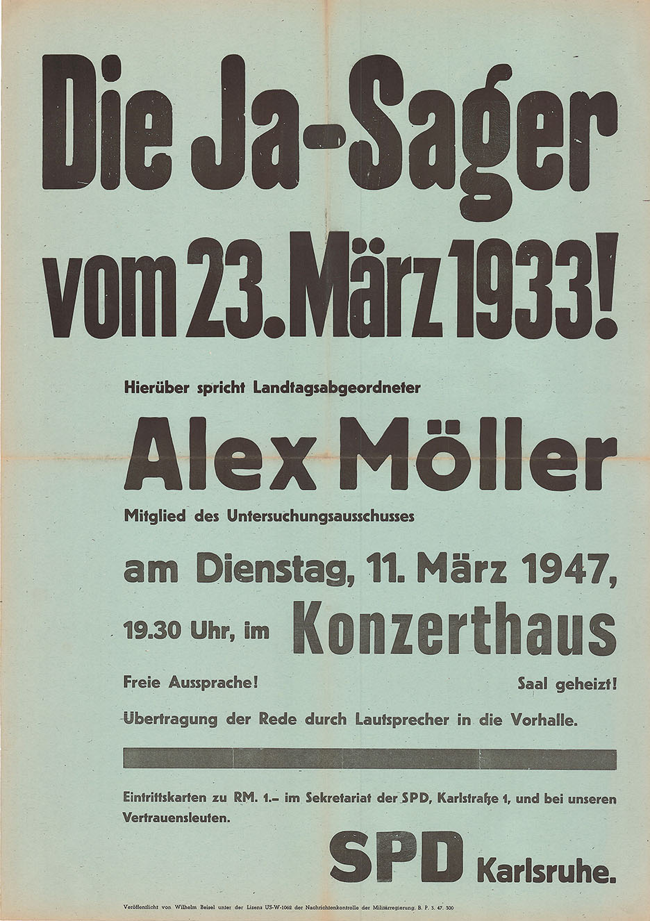 Plakat zu einer Veranstaltung der SPD am 11. März 1947, Stadtarchiv Karlsruhe 8/PBS X 3195.
