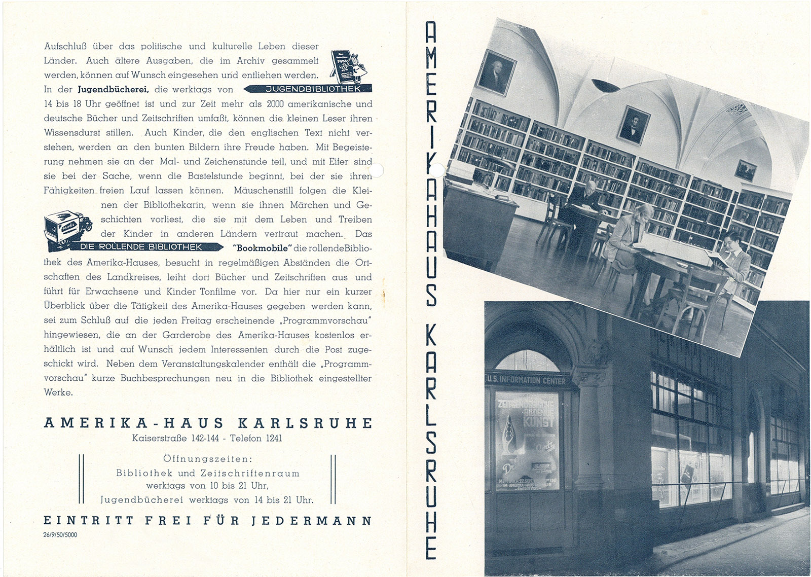 Prospekt des Amerika-Hauses mit einer Außenansicht und einem Blick in die Bibliothek, 1950, Stadtarchiv Karlsruhe 8/Alben 477/77.
