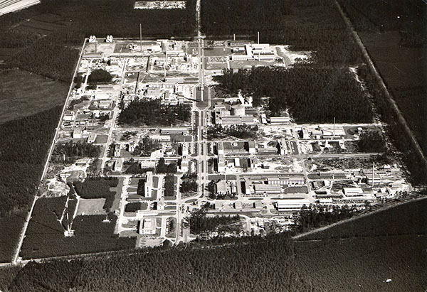 Luftaufnahme des Reaktorgeländes, um 1965, Stadtarchiv Karlsruhe 8/BA VV 3275.
