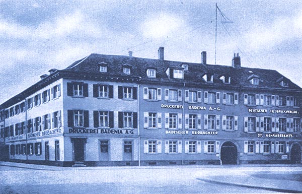 Der Gebäudekomplex der Badenia Druckerei mit Badischem Beobachter Ecke Adlerstraße/Steinstraße, 1927, Badenia-Archiv.
