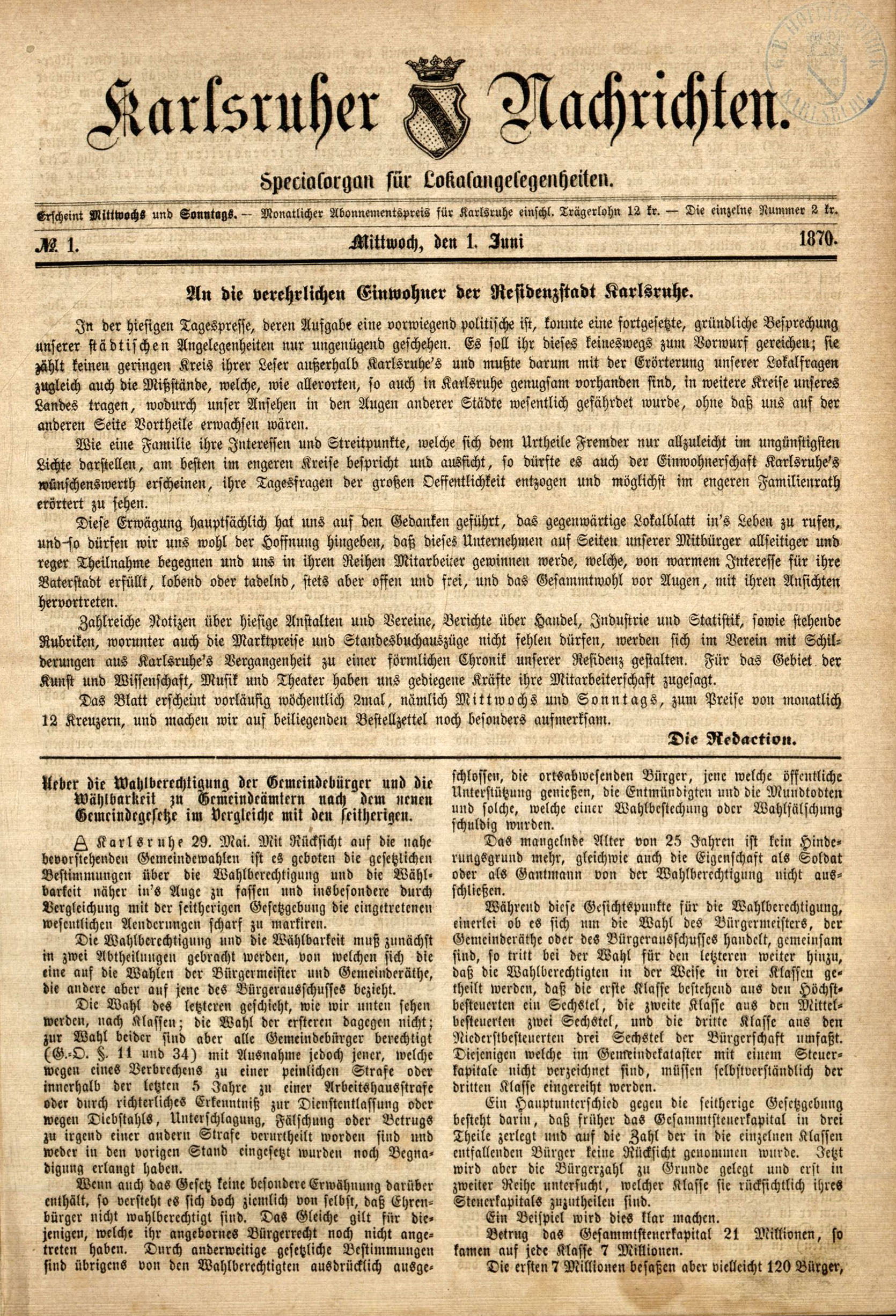Die erste Ausgabe der Karlsruher Nachrichten vom 1. Juni 1870, Stadtarchiv Karlsruhe 8/Ze 4.