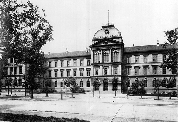 Hauptfassade des Friedrichs-Schulhauses (jetzt Helmholtz-Gymnasium) an der Kaiserallee, 1910, Stadtarchiv Karlsruhe 8/Alben 42/91.