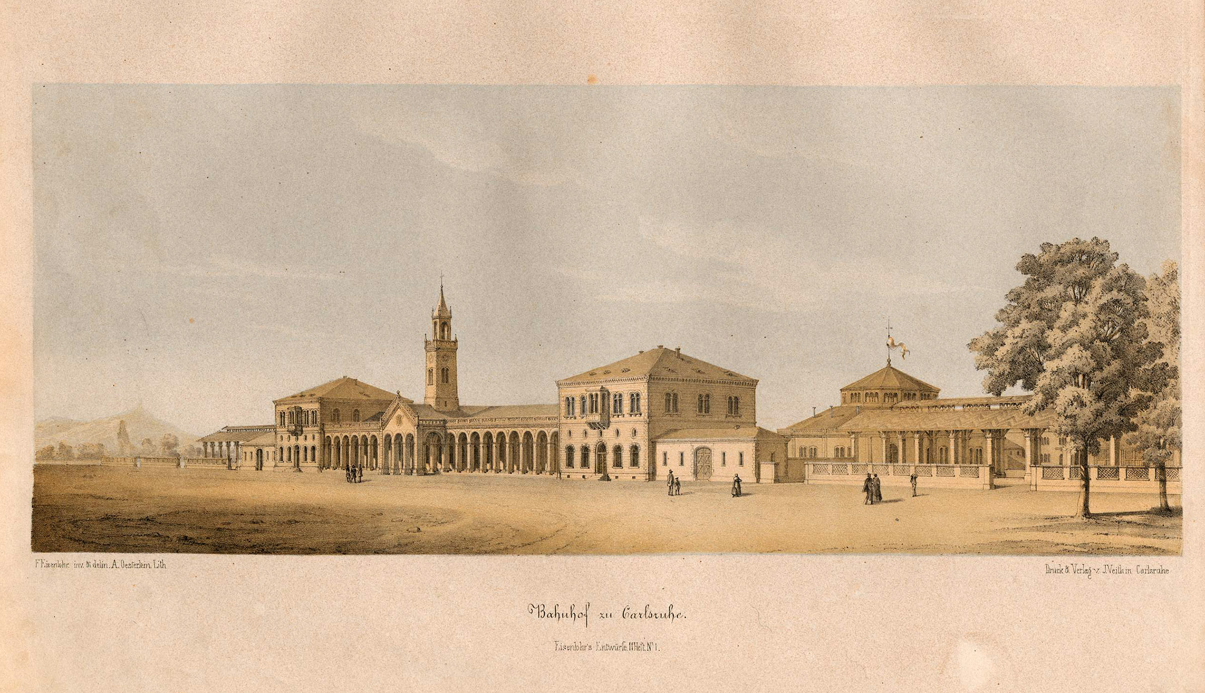 Bahnhof von Friedrich Eisenlohr, nach 1844, Bild aus: Friedrich Eisenlohr: Ausgeführte oder zur Ausführung bestimmte Entwürfe von Gebäuden verschiedener Gattung […], Carlsruhe [1852].