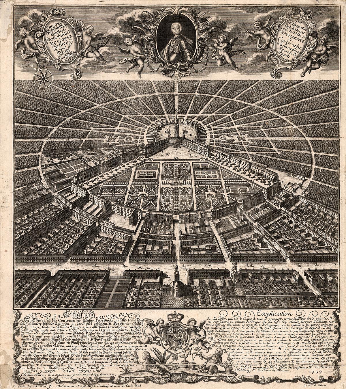 Das von Andreas Jacob Maschenbauer 1739 gedruckte "Prospect Hoch Fürstlich-Baden-Durlachischer Residenz Schloß und Stadt Karls-Ruhe", Stadtarchiv Karlsruhe 8/PBS XVI 48.