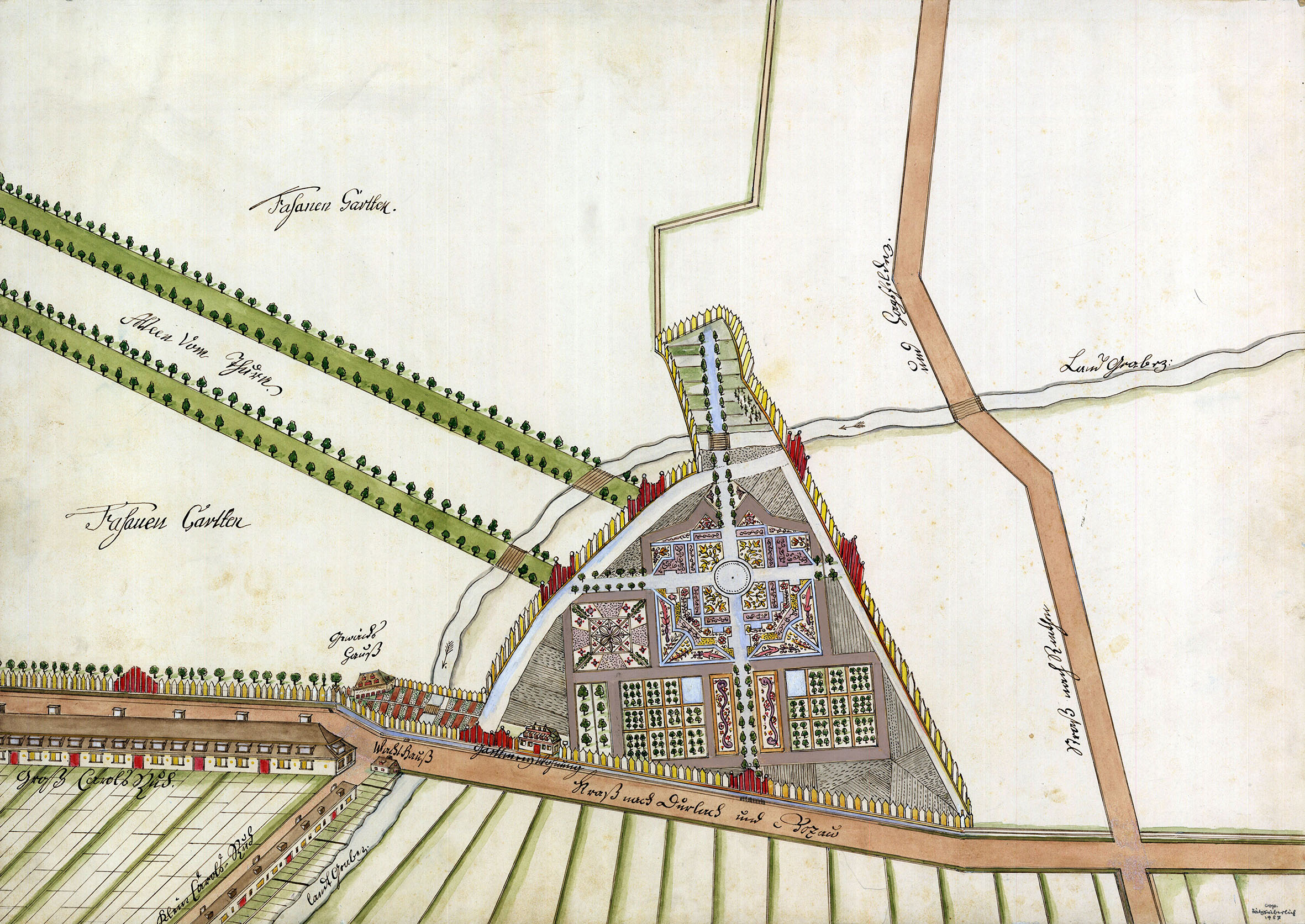 Plan des markgräflichen Küchengartens am Durlacher Tor mit Darstellung der Modellhäuser der östlichen Langen Straße in "Groß Carols Ruh" und der kleinen Tagelöhnerhäuschen am Landgraben in "Klein Carols-Ruh", 1723, Stadtarchiv Karlsruhe 8/PBS XVI 1041.