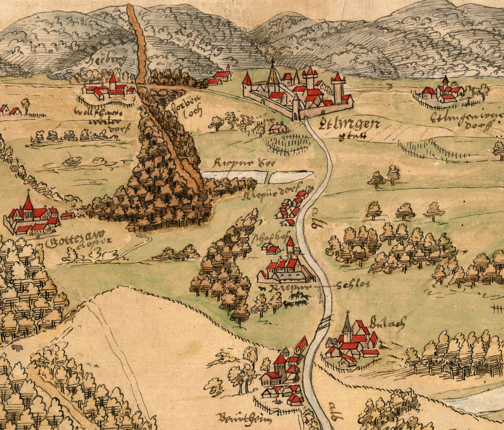 Schloss und Dorf Rüppurr auf einer Panoramakarte des 16. Jahrhunderts (Ausschnitt), Stadtarchiv Karlsruhe 8/PBS XVI 1.