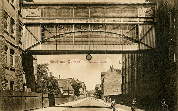 Blick in die Amalienstraße (heute Amalienbadstraße) mit der Brücke der Firma Gritzner (später Pfaff), Pfinzgaumuseum Durlach U I 1105.