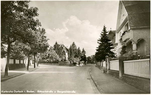 Blick von Norden auf die Einmündung der Bergwaldstraße (rechts) in die Rittnertstraße, 1944, Pfinzgaumuseum Durlach U I 1338.