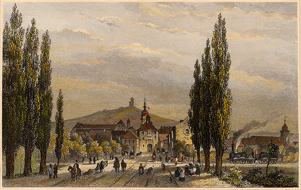 Durlach von Westen mit Bahnlinie und Bahnhof im Jahr 1844, Stich von Louis Hoffmeister, Stadtarchiv Karlsruhe 8/PBS oXIIIa 23.