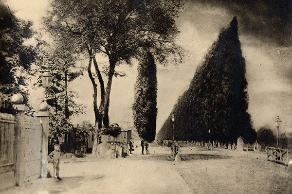 Ortsausgang Durlach Richtung Karlsruhe; im Vordergrund links die Ecke des damaligen Hengst'schen Gartens; am Beginn der Allee der Bahnübergang der alten Eisenbahntrasse Karlsruhe-Heidelberg, 1880, Pfinzgaumusuem Durlach U I 510/9.