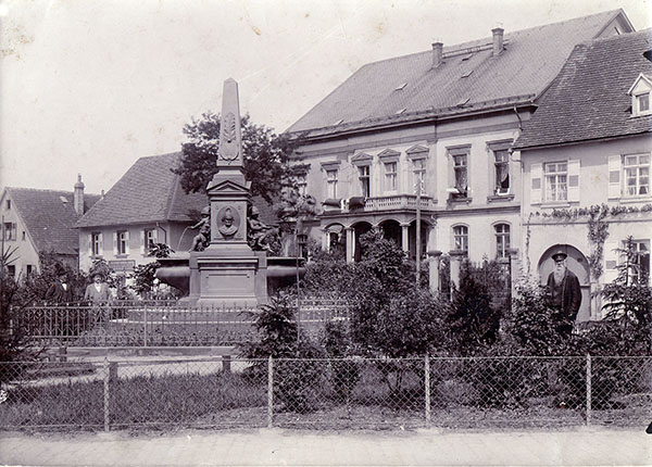 Der Blumenplatz (heute Hengstplatz) mit dem Denkmal für Christian Hengst, 1896, Pfinzgaumuseum Durlach U I 83,2.