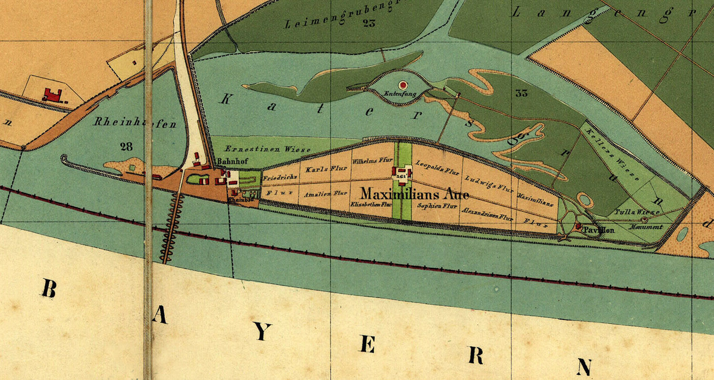 Knielinger Gemarkungsplan von 1869 (Norden ist links), Ausschnitt mit der Bebauung von Maxau: Schiffbrücke, Brückenkopfbauten und Gebäude des Hofguts, rechts sind auch das Tulladenkmal (Monument) und das Schlösschen des Markgrafen (Pavillon) eingezeichnet, Stadtarchiv Karlsruhe 8/PBS XVI 221 (Ausschnitt).
