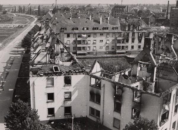 Der Nordstern-Wohnblock in der Sonnenstraße 2 wurde während des Zweiten Weltkriegs mehrfach von Bomben getroffen, um 1942, Stadtarchiv Karlsruhe 8/Alben 6/61a.