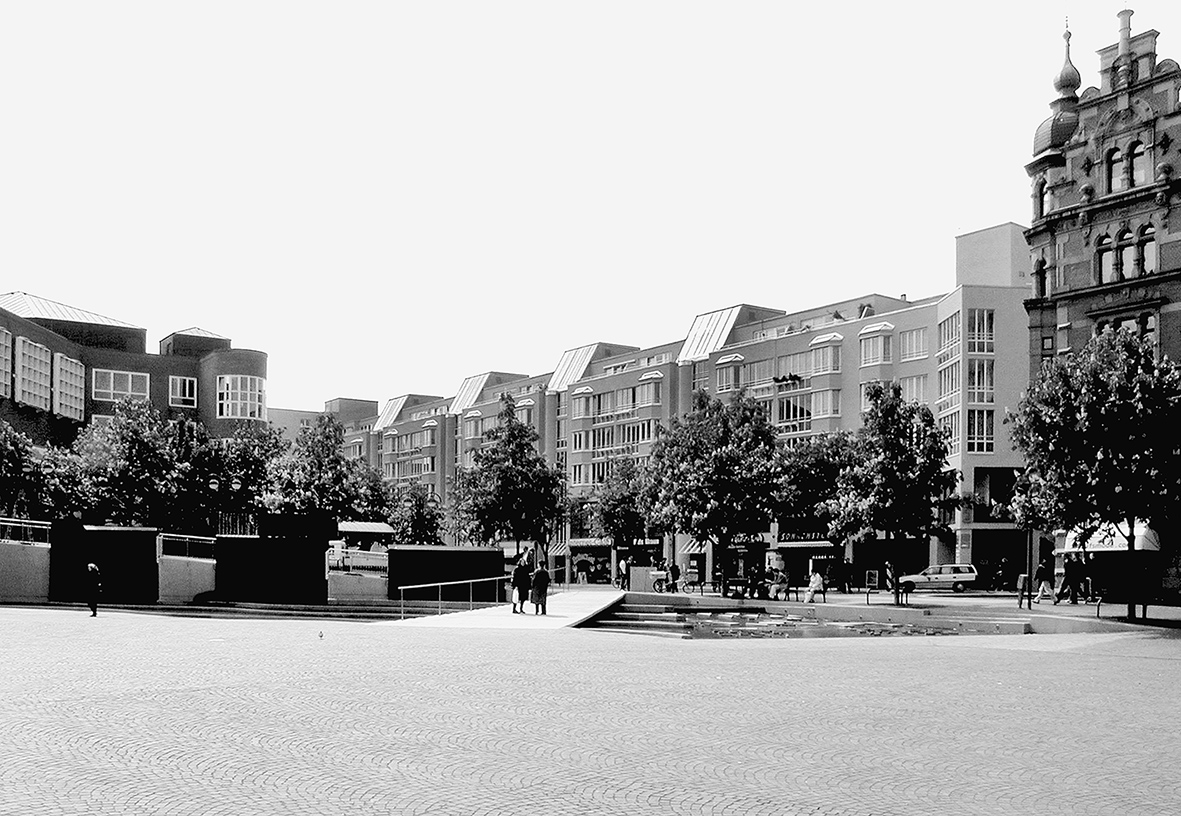 Ansicht des Kronenplatzes nach Süden mit den Wasserspielen vor dem Jubez und der Blockrandbebauung von Hilmer und Sattler, rechts das Hohenzollerhaus, Foto: Monika Müller-Gmelin 2002, Bildstelle der Stadt Karlsruhe.
