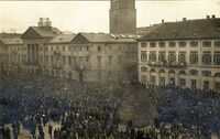 Menschenansammlung auf dem Marktplatz anlässlich der Erklärung des Großherzogs Friedrich II., auf die Regierungsgewalt zu verzichten, 13. November 1918, Stadtarchiv Karlsruhe 8/PBS oVI 35.