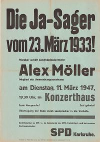 Schon bald nach Kriegsende wurden Sozialdemokraten wieder aktiv und nahmen beim Wiederaufbau unter anderem im Bezirksverwaltungsamt unter Leitung von August Furrer sen. wichtige Aufgaben wahr. Die offizielle Wiedergründung der SPD erfolgte am 21. September 1945 in der Gaststätte Zum weißen Berg mit Friedrich Töpper als erstem Vorsitzenden. In der Folgezeit war die SPD die dominierende politische Kraft in der Stadt. 1945-1970 stellte sie mit Hermann Veit (1945/46), Friedrich Töpper (1947-1952) und Günther Klotz (1952-1970) die Oberbürgermeister, 1947-1975 gehörte die Mehrheit - 1959-1968 die absolute Mehrheit - der Karlsruher Stadträtinnen und Stadträte der SPD an. Bis heute blieb die SPD im Stadtrat die zweitstärkste Partei, stellte regelmäßig Bürgermeister und seit 2013 erneut den Oberbürgermeister. Auf Landes- und Bundesebene blieb die SPD bei den Wahlergebnissen in der Regel hinter der CDU zurück, erstmals gewann sie 1969 das Direktmandat für den Bundestag. Gleichwohl gelangten Mitglieder der Karlsruher SPD in den Landtag, den Bundestag und das Europaparlament, so bis zu den 1990er Jahren zum Beispiel Hermann Veit, Alex Möller, Fritz und Peter Corterier, Hanne Landgraf, Gerlinde Hämmerle und Heinke Salisch.