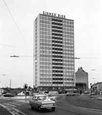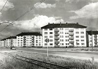 Die verheerende Wohnungsnot nach dem Zweiten Weltkrieg setzte in den 1950er- und 60er-Jahren eine enorme Bautätigkeit der 1951 aus der Fusion der Wohnungsgesellschaft Ettlinger Tor mbH mit den beiden Tochtergesellschaften – der 1928 gegründeten Volkswohnung GmbH und der erst 1947 geschaffenen Neubürgersiedlung GmbH – entstandenen 'neuen' "Volkswohnung GmbH" in Gang. Von 1953 bis1956 schuf das gemeinnützige Unternehmen mit der Bebauung des Mühlburger Felds und des Rintheimer Felds zwei Wohnsiedlungen in fünfgeschossiger Zeilenbauweise mit ca. 1.300 und 874 Mietwohnungen. Eine weitere Maßnahme, mit welcher der akuten Wohnungsnot entgegengewirkt werden sollte, war ab 1957 der Bau der Waldstadt. In Zusammenarbeit mit dem Bundeswohnungsbauministerium hatte die Stadt ein Demonstrativ-Bauprogramm entwickelt, das der Volkswohnung GmbH ermöglichte, bis 1960 etwa 450 kostengünstige Mietwohnungen, wiederum in fünfgeschossigem Zeilenbau, zu erstellen. 1965 gehörten der Gesellschaft 1.235 Wohnungen in der Königsberger, der Insterburger und der Kolberger Straße.
