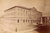 Um den Bedarf an mehr Unterrichtsräumen für die steigende Zahl an Schülerinnen und Schülern zu decken, trieb der Durlacher Bürgermeister Carl Friderich in den 1870er-Jahren den Bau eines neuen großen Schulgebäudes voran. Im Oktober 1874 kaufte die Stadt für 27.000 Gulden die Amtskellerei samt Speichergebäude und den sie umgebenden Platz in der Hauptstraße (Pfinztalstraße). Nach dem Abriss des Gebäudekomplexes wurden darauf nach Plänen des Oberbaurats Heinrich Lang 1877/78 das neue Schulhaus samt Turnhalle und das Kriegerdenkmal errichtet. Hier sollten Schülerinnen und Schüler des Pädagogiums (Progymnasium), der höheren Bürgerschule (Realgymnasium) und der Volksschule unterrichtet werden.