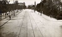 Auf der anderen Seite grüßt das Direktorenhaus der Zooverwaltung, 1905 von Stadtbaurat Strieder als Heimatstil-Villa mit Zierfachwerk erbaut (Nr. 6). An der spitzwinkligen Kreuzung mit der Straße Am Stadtgarten leitet der Raiffeisen-Brunnen, 1969 geschaffen von Emil Sutor, optisch zur viergeschossigen Randbebauung dieses Blocks über (Nrn. 12-22). Der Brunnen bezieht sich gleichfalls auf das 1953 fertiggestellte, sechsgeschossige Raiffeisenhaus, später Spar- und Kreditbank (2017 Fusion mit der Volksbank Karlsruhe), an der Ecke zur Lauterbergstraße gegenüber (Lauterbergstraße 1). Ihm folgt ein historistisches Wohnhaus mit Sandsteinfassade und Ziergiebeln, 1899 von Camill Frei errichtet (Nr. 59). Gegenüber der Einmündung der Poststraße folgt schließlich die zweigeschossige Villa Printz, 1891 im Neorenaissance-Stil mit Mansarddach von Hermann Walder (1847-1921) für die Hofkunstfärberei Eduard Printz errichtet (Nr. 67), bevor die Straße im langgezogenen Schlund einer der beiden letzten originalen Brücken von 1913 unter den Gleisanlagen des Hauptbahnhofs verschwindet.