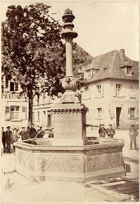 Spitalplatz (heute Lidellplatz), von 1876-1979 in der Platzmitte; seit 1979 an der nordöstlichen Platzecke.